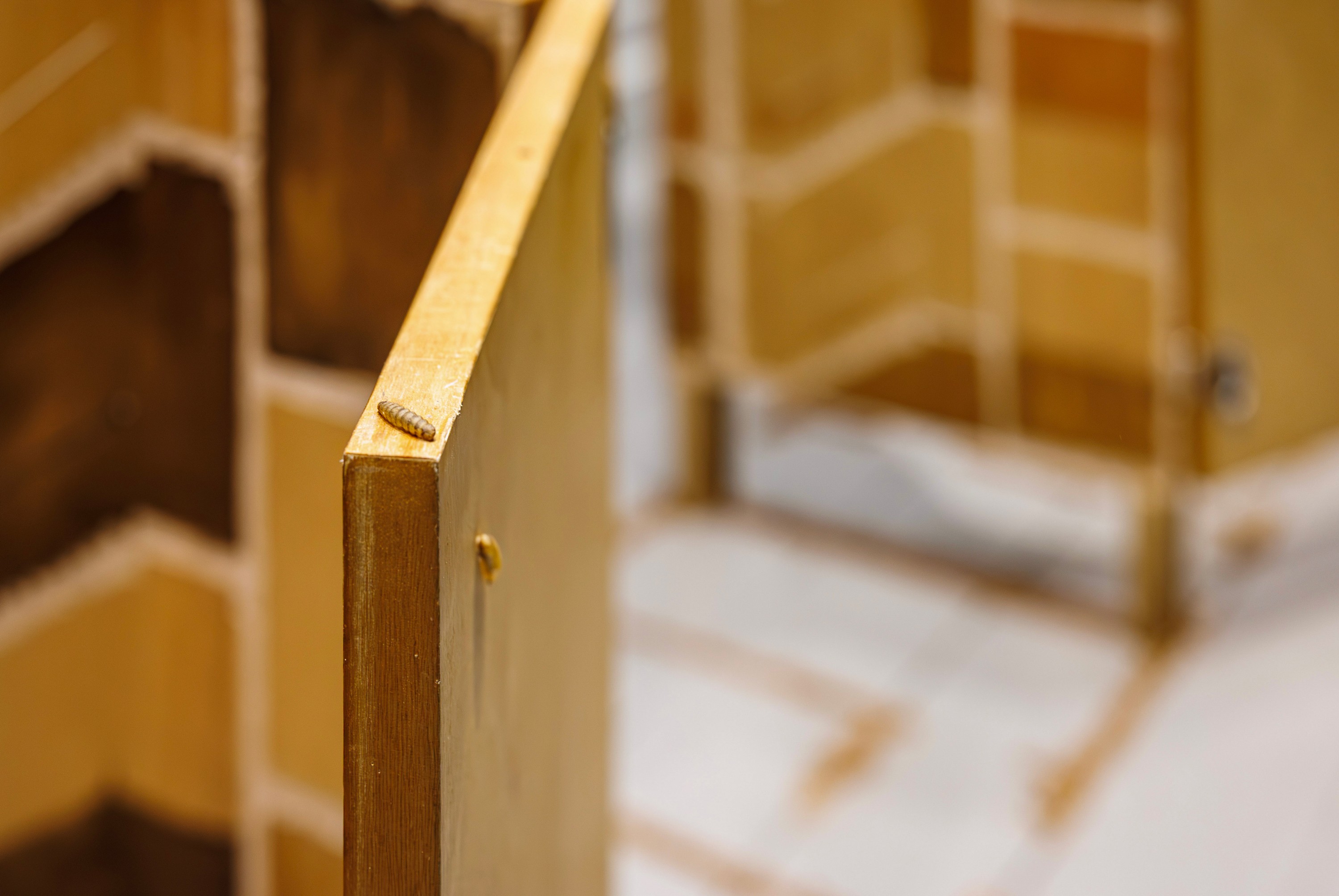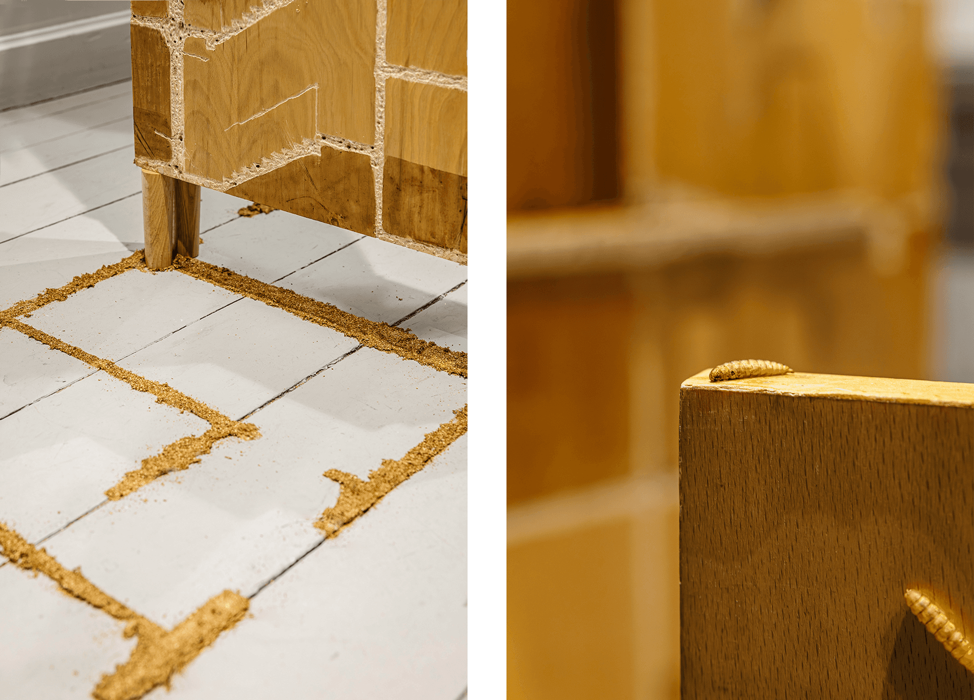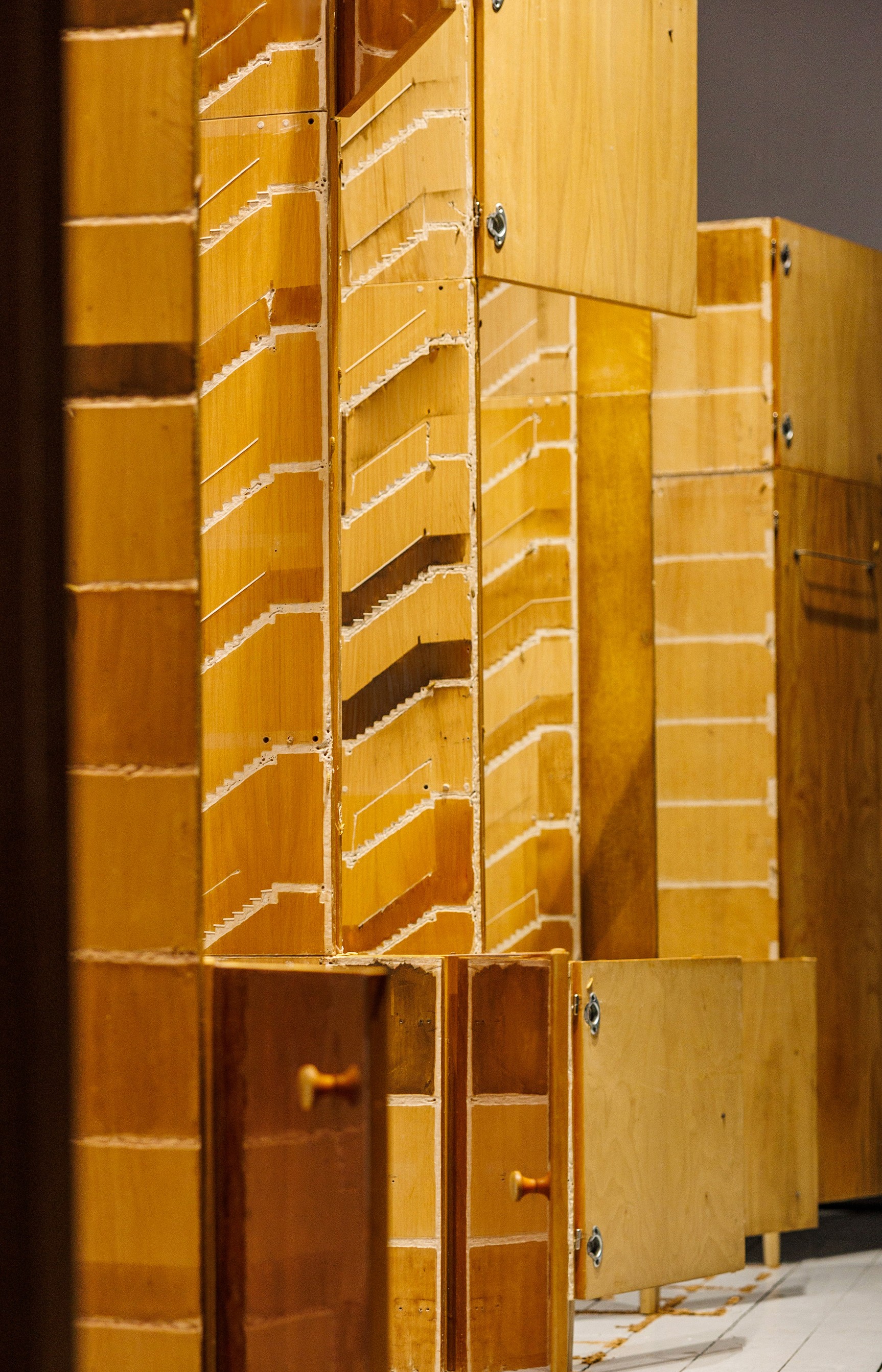 Sovetskaya Stenka - the iconic Soviet cupboard-wall - is transformed into a 1:18 dollhouse of a typical Soviet apartment block. Once an emotional and ideological load-bearing wall, it staged obedience, silence, and the image of the “correct” citizen. Behind its polished surfaces, this work excavates what still lingers beneath the veneer: interiors shaped by ideology, fear, loss, and survival. As parasites bore through wood and memory, they become symbols of an empire that never disappeared but merely changed form. Not a nostalgic reconstruction, Load-Bearing Wall exposes how imposed identity, colonial violence, cultural erasure, and displacement persist, echoing today’s neo-imperial aggression and the ongoing war against Ukraine.
